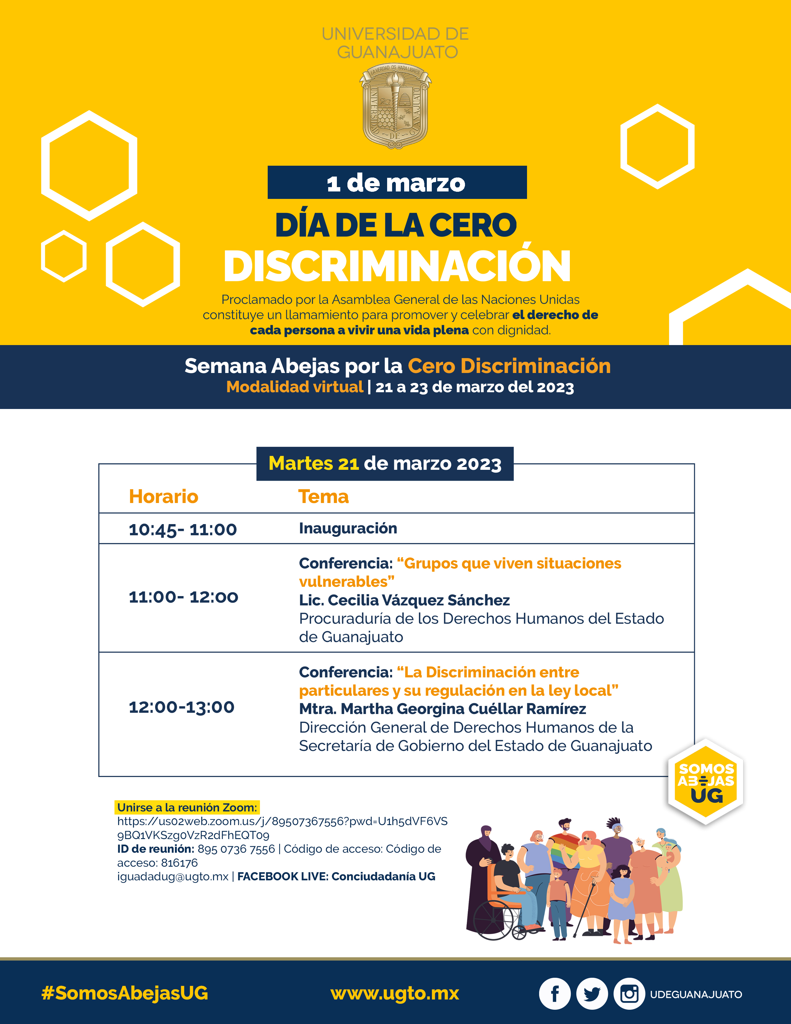 Con el gusto de saludarte, me permito extenderte una cordial invitación, al evento de la Conmemoración Día para la cero Discriminación, organizado por la Coordinación de Igualdad de la Universidad de Guanajuato , se llevará a cabo el día 01 de marzo, en un horario de las 10:30 a.m. a través de la plataforma digital Zoom.