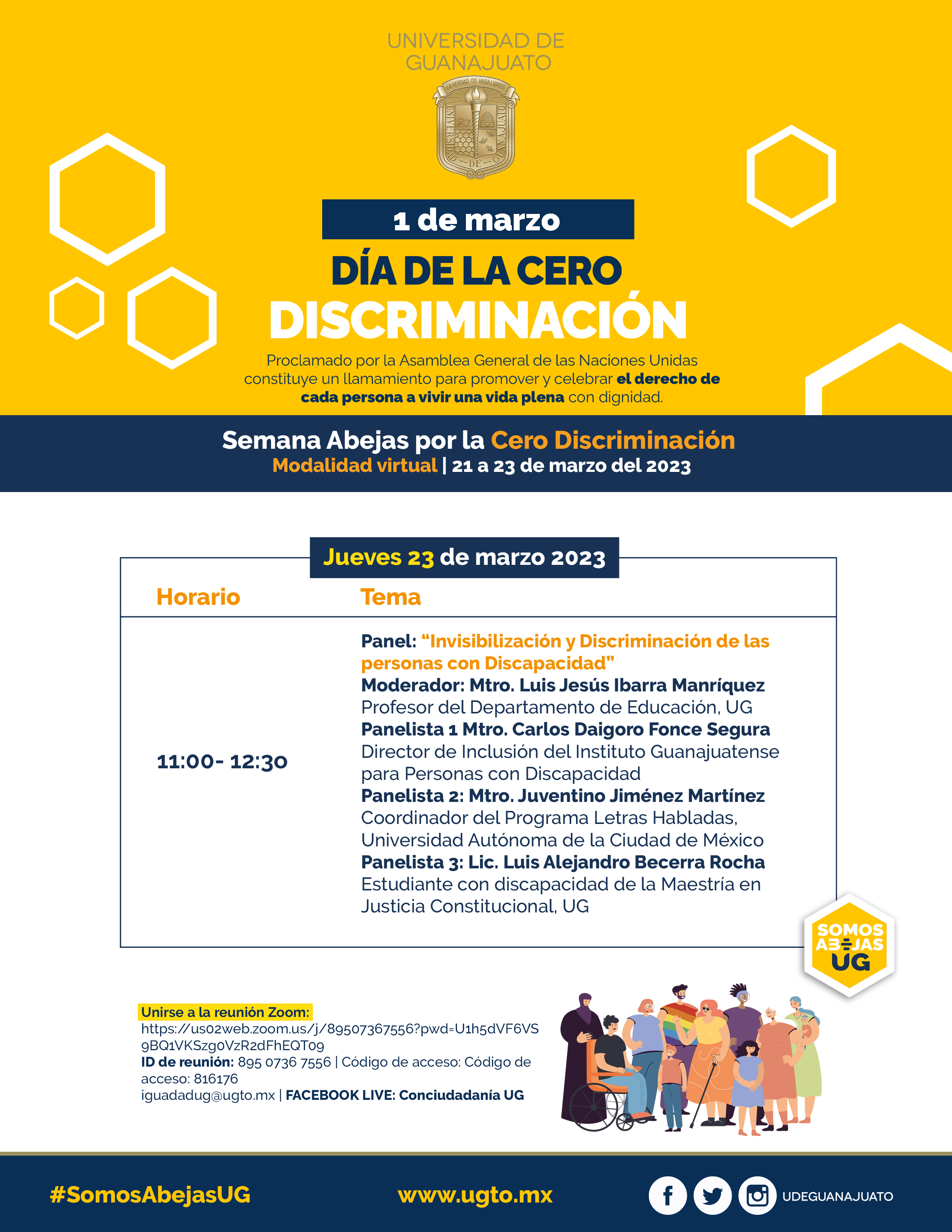 Con el gusto de saludarte, me permito extenderte una cordial invitación, al evento de la Conmemoración Día para la cero Discriminación, organizado por la Coordinación de Igualdad de la Universidad de Guanajuato , se llevará a cabo el día 01 de marzo, en un horario de las 10:30 a.m. a través de la plataforma digital Zoom.