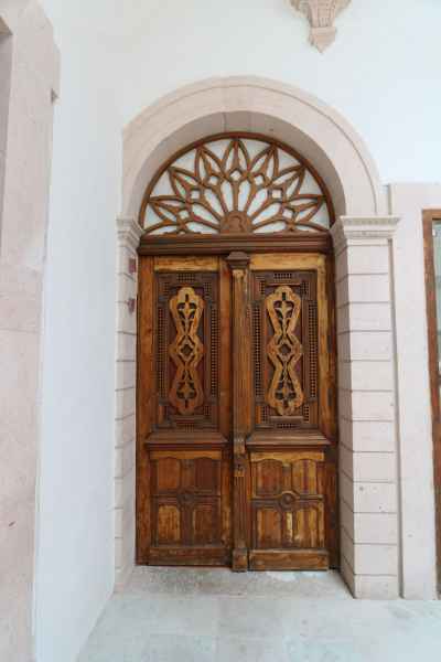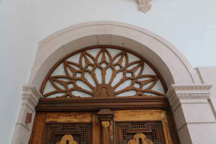 El vano central está coronado por un frontispicio que enmarca una cartela donde por lo general se ubicaba el escudo de armas de la familia o algún motivo religioso de la devoción del propietario. Dicho frontispicio está rematado por un frontón triangular denticulado y custodiado por dos jarrones con motivos fitomorfos.