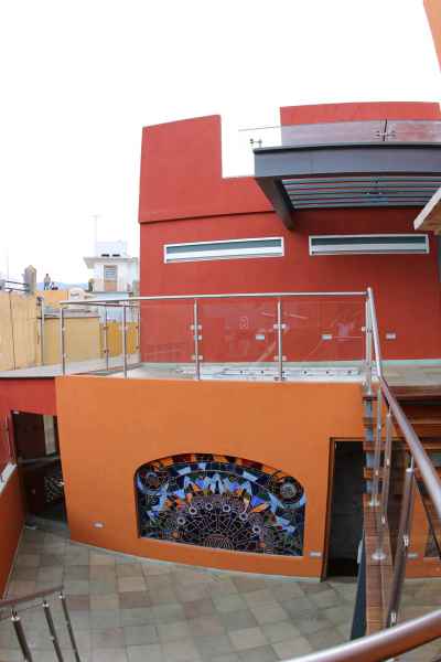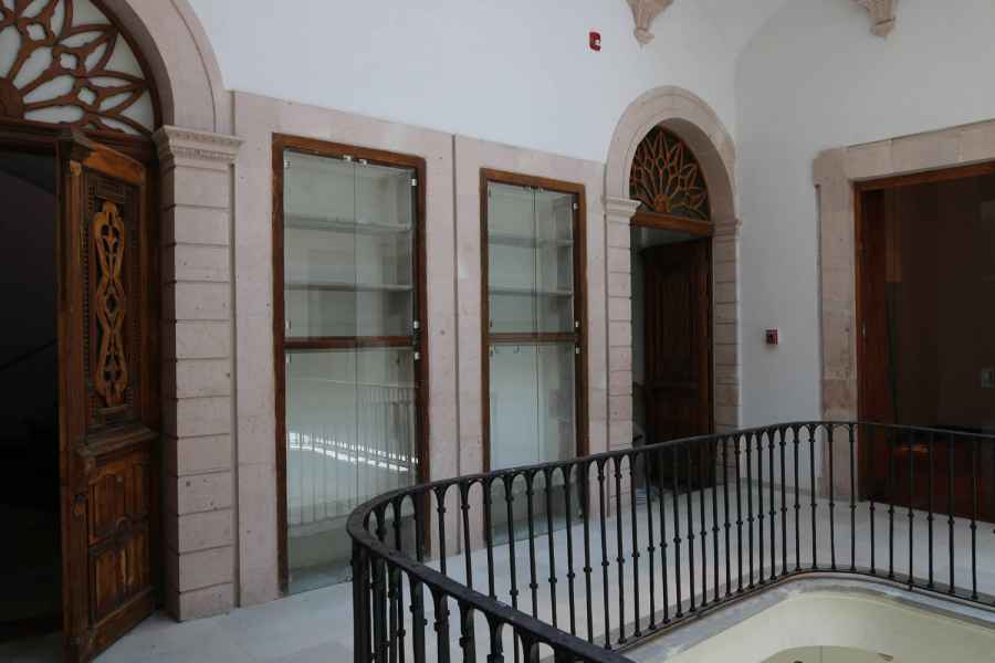 El primer cuerpo presenta el acceso al zaguán al centro y es de mayor dimensión que los vanos laterales que, en forma de pares, se distribuyen a cada lado del acceso. Los vanos están enmarcados por jambas y cerramiento de cantería rosa con traslapes en las esquinas, clara influencia del estilo barroco que para esta época se encontraba en declive.