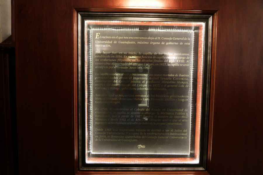 Desde 1963 este majestuoso espacio se destinó a ser el Salón del Consejo Universitario. Y a causa de la reestructuración institucional en 2008, se denomina ahora Salón del Consejo General Universitario de la Universidad de Guanajuato.